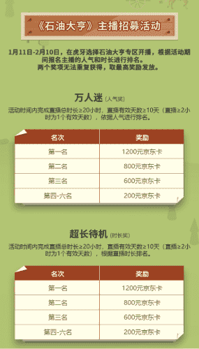 除了“油王”争霸赛,,精英主播招募活动亦同步开启!!!赛事分时长奖和人气奖,,奖励同样丰厚!!!!