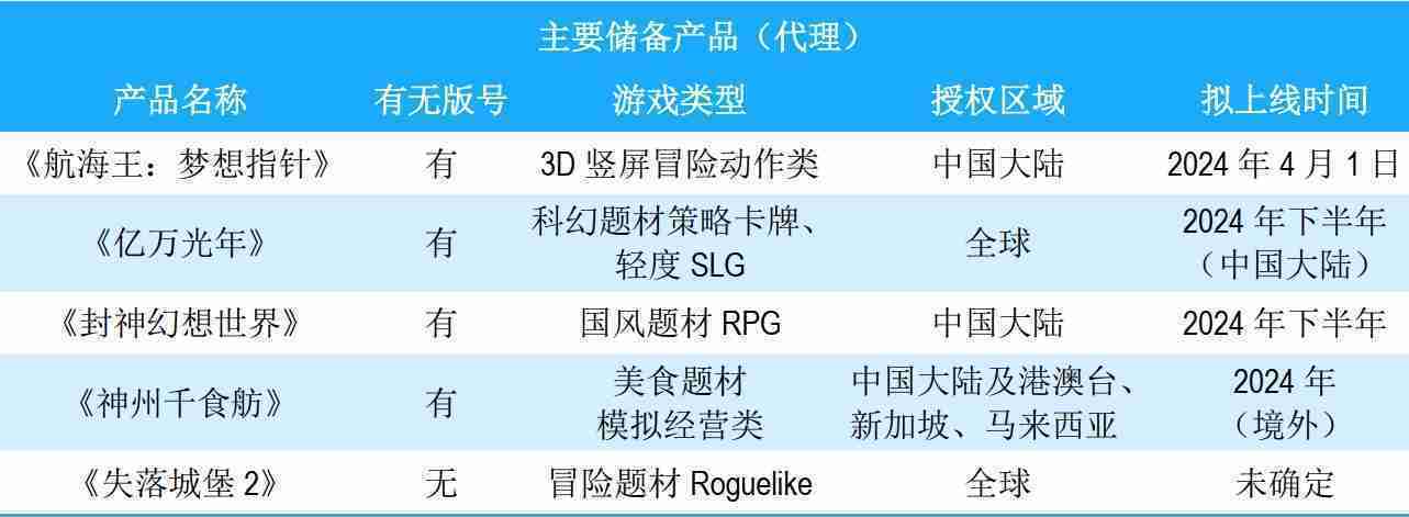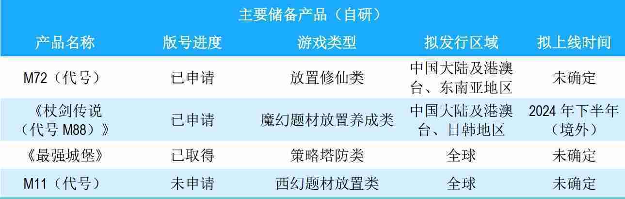 公司储备的多个自研、、代理产品都在有序推进当中,,,,涵盖放置类、、、策略类、、模拟经营类、、、、RPG、、Roguelike等多元化游戏品类,,,,储备的主要自研和代理产品如下::